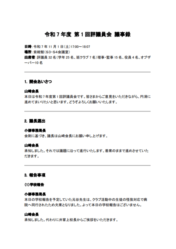 令和7年度 第1回評議員会の(R7.11.1)議事録を掲載いたしました
